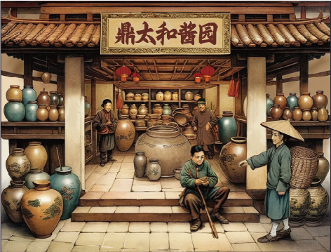 宜昌老字号(位于鼓楼街),制作和出售酱菜、面酱、酱油等的作坊、店铺,前店后坊,整齐地摆放着盛装各种酱菜、面酱、酱油成品的坛子,分别贴上红纸标签。